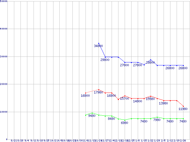 | 2.5inch SATA SSD (SSD,2.5インチ,リード165MB/s・ライト95MB/s)の最安値推移 | | | (2008年8月21日~2009年2月26日) |