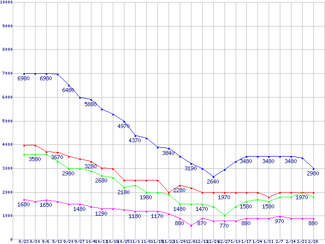 PC2-6400(DDR2-800) DDR2 SDRAM DIMMの最安値推移