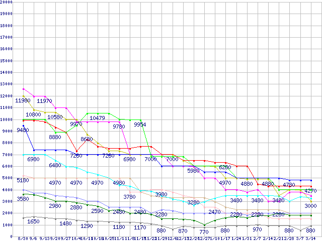 メモリ主要製品(最安値5千円~1万円未満)の最安値推移