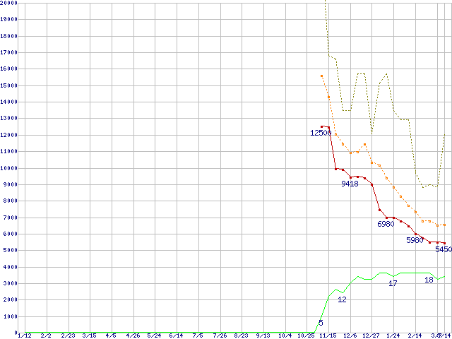 ※このグラフは過去のデータも税率5%相当に調整した税込み相当額のグラフです。 税率変更や、総額表示方式導入(2004年4月)の影響は除いています。 | | | ●凡例 | 最安値 (点線部は販売店未確認 または未調査) | 平均値 | 最高値 | ショップ数 |