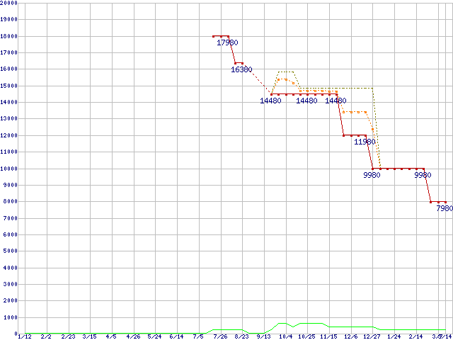 PC3-12800(DDR3-1600) DDR3 SDRAM DIMMの最安値推移