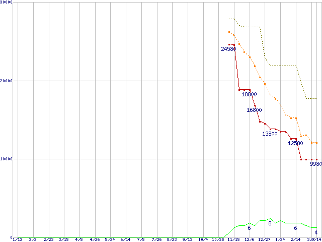 ※このグラフは過去のデータも税率5%相当に調整した税込み相当額のグラフです。 税率変更や、総額表示方式導入(2004年4月)の影響は除いています。 | | | ●凡例 | 最安値 (点線部は販売店未確認 または未調査) | 平均値 | 最高値 | ショップ数 |