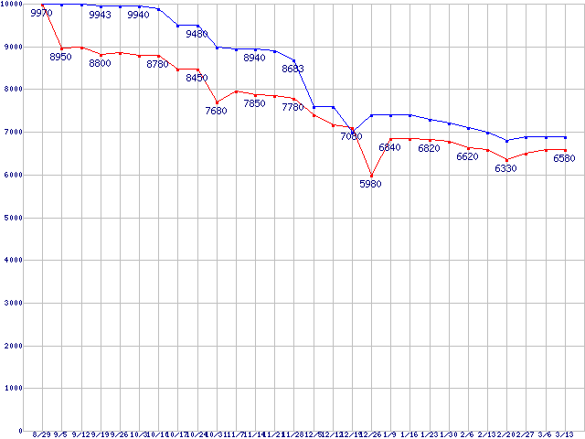 | Socket AM2 (HyperTransport,Dual Core,TDP 65W)の最安値推移 | | | (2008年8月29日~2009年3月13日) |