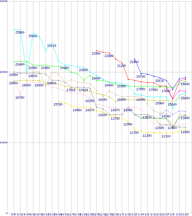 | CPU主要製品(最安値1万円~2万円未満)の最安値推移 | | | (2008年9月5日~2009年3月20日) |