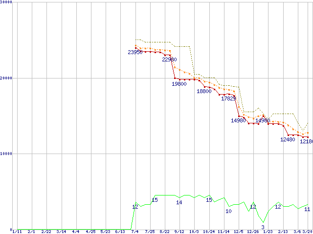 ※このグラフは過去のデータも税率5%相当に調整した税込み相当額のグラフです。 税率変更や、総額表示方式導入(2004年4月)の影響は除いています。 | | | ●凡例 | 最安値 (点線部は販売店未確認 または未調査) | 平均値 | 最高値 | ショップ数 |