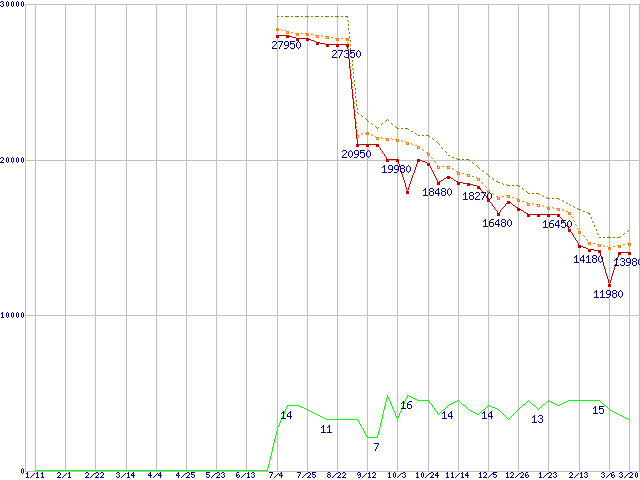 ※このグラフは過去のデータも税率5%相当に調整した税込み相当額のグラフです。 税率変更や、総額表示方式導入(2004年4月)の影響は除いています。 | | | ●凡例 | 最安値 (点線部は販売店未確認 または未調査) | 平均値 | 最高値 | ショップ数 |