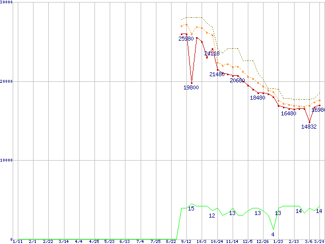 ※このグラフは過去のデータも税率5%相当に調整した税込み相当額のグラフです。 税率変更や、総額表示方式導入(2004年4月)の影響は除いています。 | | | ●凡例 | 最安値 (点線部は販売店未確認 または未調査) | 平均値 | 最高値 | ショップ数 |