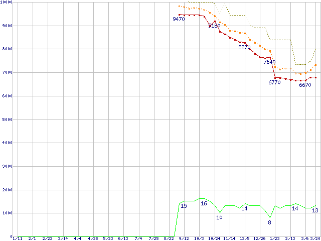 ※このグラフは過去のデータも税率5%相当に調整した税込み相当額のグラフです。 税率変更や、総額表示方式導入(2004年4月)の影響は除いています。 | | | ●凡例 | 最安値 (点線部は販売店未確認 または未調査) | 平均値 | 最高値 | ショップ数 |