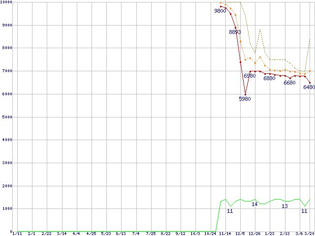 ※このグラフは過去のデータも税率5%相当に調整した税込み相当額のグラフです。 税率変更や、総額表示方式導入(2004年4月)の影響は除いています。 | | | ●凡例 | 最安値 (点線部は販売店未確認 または未調査) | 平均値 | 最高値 | ショップ数 |