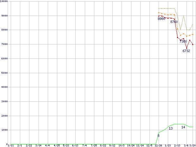 | Athlon X2 7750 Black Edition (2.7GHz,L2 512KB×2,L3 2MB)の価格推移 | | | (2008年1月11日~2009年3月20日) |