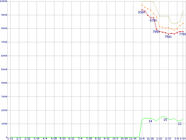 ※このグラフは過去のデータも税率5%相当に調整した税込み相当額のグラフです。 税率変更や、総額表示方式導入(2004年4月)の影響は除いています。 | | | ●凡例 | 最安値 (点線部は販売店未確認 または未調査) | 平均値 | 最高値 | ショップ数 |