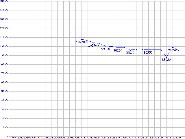| LGA1366 (QPI 6.4GT/s,L3キャッシュ8MB,Quad Core,Hyper-Threading)の最安値推移 | | | (2008年9月5日~2009年3月20日) |