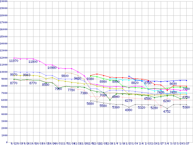| CPU主要製品(最安値1万円未満)の最安値推移 | | | (2008年9月12日~2009年3月27日) |