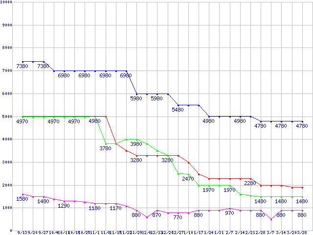 メモリ主要製品(最安値5千円未満)の最安値推移