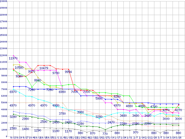 メモリ主要製品(最安値5千円~1万円未満)の最安値推移