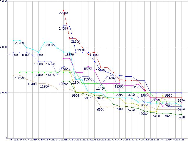 メモリ主要製品(最安値5千円~1万円未満)の最安値推移