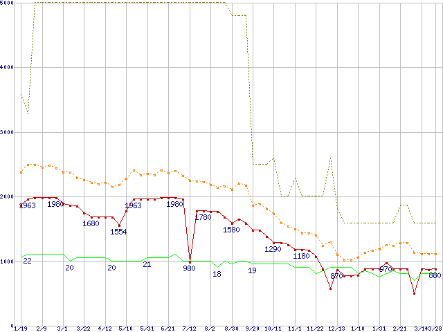※このグラフは過去のデータも税率5%相当に調整した税込み相当額のグラフです。 税率変更や、総額表示方式導入(2004年4月)の影響は除いています。 | | | ●凡例 | 最安値 (点線部は販売店未確認 または未調査) | 平均値 | 最高値 | ショップ数 |