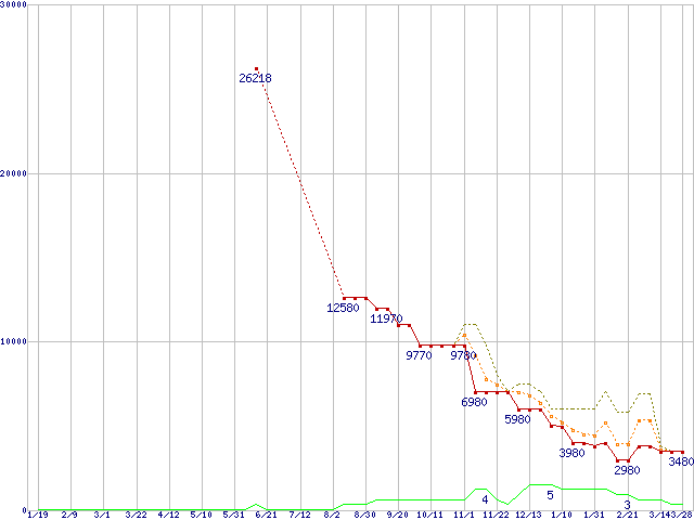 ※このグラフは過去のデータも税率5%相当に調整した税込み相当額のグラフです。 税率変更や、総額表示方式導入(2004年4月)の影響は除いています。 | | | ●凡例 | 最安値 (点線部は販売店未確認 または未調査) | 平均値 | 最高値 | ショップ数 |
