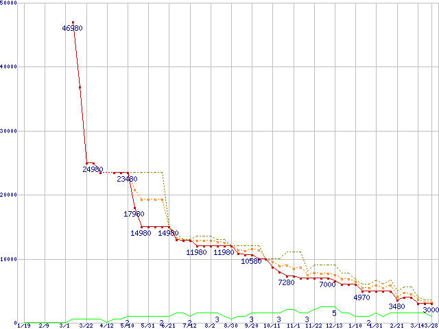 ※このグラフは過去のデータも税率5%相当に調整した税込み相当額のグラフです。 税率変更や、総額表示方式導入(2004年4月)の影響は除いています。 | | | ●凡例 | 最安値 (点線部は販売店未確認 または未調査) | 平均値 | 最高値 | ショップ数 |