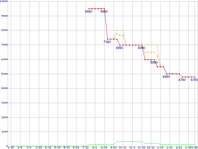 ※このグラフは過去のデータも税率5%相当に調整した税込み相当額のグラフです。 税率変更や、総額表示方式導入(2004年4月)の影響は除いています。 | | | ●凡例 | 最安値 (点線部は販売店未確認 または未調査) | 平均値 | 最高値 | ショップ数 |