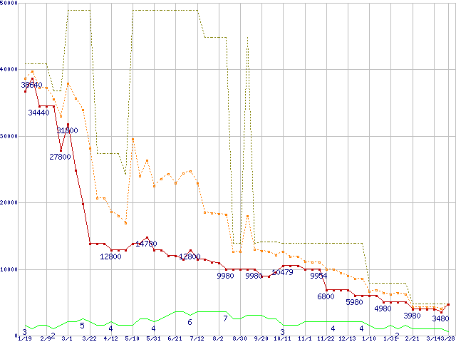 メモリ主要製品(最安値5千円未満)の最安値推移