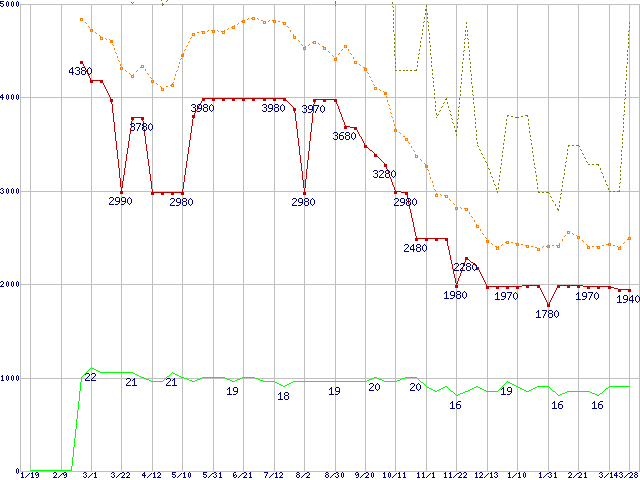 ※このグラフは過去のデータも税率5%相当に調整した税込み相当額のグラフです。 税率変更や、総額表示方式導入(2004年4月)の影響は除いています。 | | | ●凡例 | 最安値 (点線部は販売店未確認 または未調査) | 平均値 | 最高値 | ショップ数 |