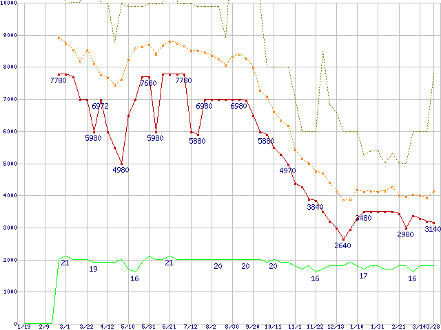 PC2-6400(DDR2-800) DDR2 SDRAM DIMMの最安値推移