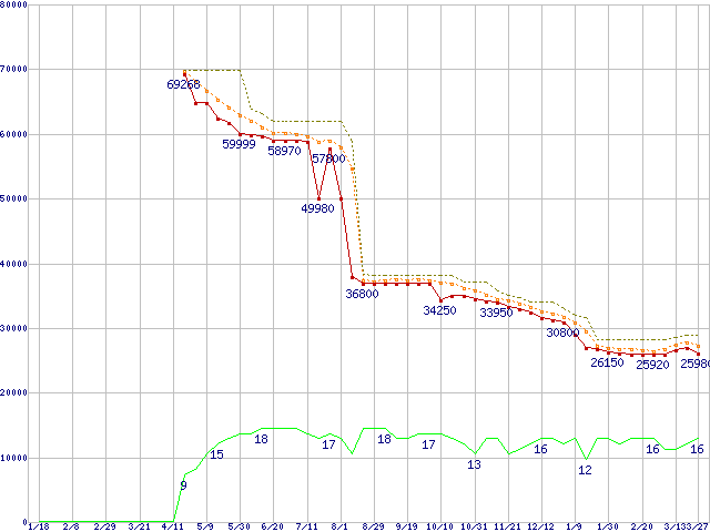 ※このグラフは過去のデータも税率5%相当に調整した税込み相当額のグラフです。 税率変更や、総額表示方式導入(2004年4月)の影響は除いています。 | | | ●凡例 | 最安値 (点線部は販売店未確認 または未調査) | 平均値 | 最高値 | ショップ数 |