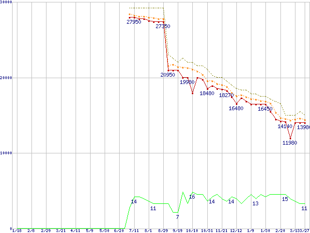 ※このグラフは過去のデータも税率5%相当に調整した税込み相当額のグラフです。 税率変更や、総額表示方式導入(2004年4月)の影響は除いています。 | | | ●凡例 | 最安値 (点線部は販売店未確認 または未調査) | 平均値 | 最高値 | ショップ数 |
