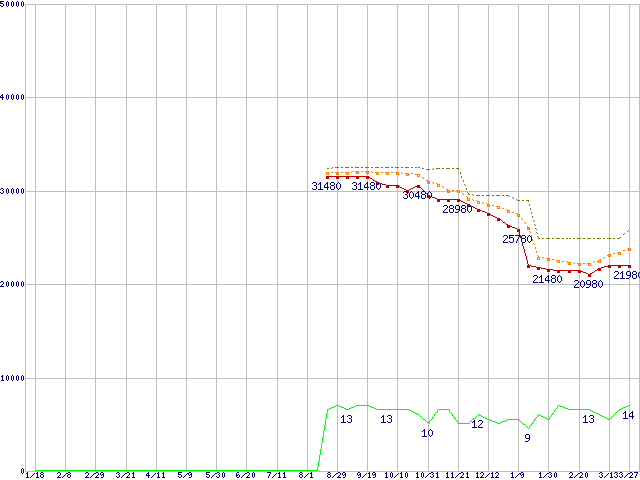 ※このグラフは過去のデータも税率5%相当に調整した税込み相当額のグラフです。 税率変更や、総額表示方式導入(2004年4月)の影響は除いています。 | | | ●凡例 | 最安値 (点線部は販売店未確認 または未調査) | 平均値 | 最高値 | ショップ数 |
