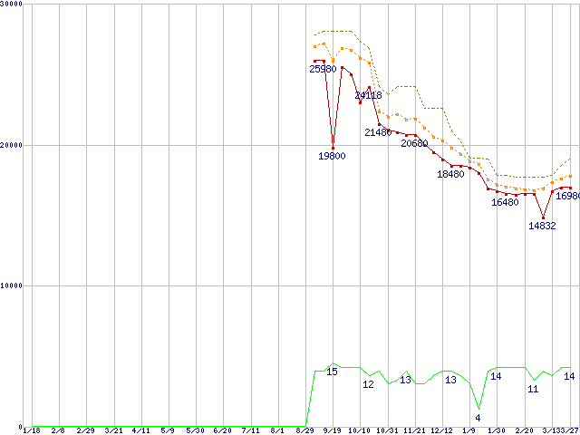 ※このグラフは過去のデータも税率5%相当に調整した税込み相当額のグラフです。 税率変更や、総額表示方式導入(2004年4月)の影響は除いています。 | | | ●凡例 | 最安値 (点線部は販売店未確認 または未調査) | 平均値 | 最高値 | ショップ数 |