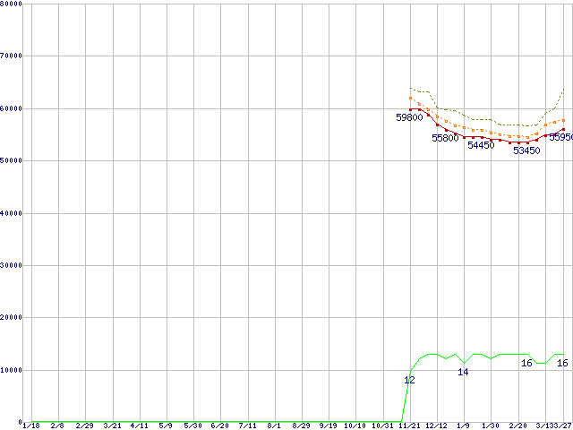 ※このグラフは過去のデータも税率5%相当に調整した税込み相当額のグラフです。 税率変更や、総額表示方式導入(2004年4月)の影響は除いています。 | | | ●凡例 | 最安値 (点線部は販売店未確認 または未調査) | 平均値 | 最高値 | ショップ数 |