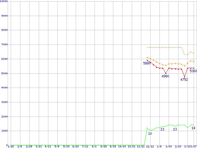 ※このグラフは過去のデータも税率5%相当に調整した税込み相当額のグラフです。 税率変更や、総額表示方式導入(2004年4月)の影響は除いています。 | | | ●凡例 | 最安値 (点線部は販売店未確認 または未調査) | 平均値 | 最高値 | ショップ数 |