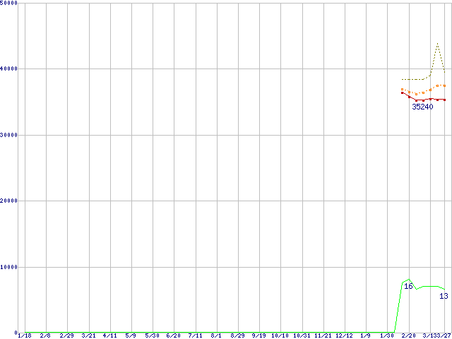 ※このグラフは過去のデータも税率5%相当に調整した税込み相当額のグラフです。 税率変更や、総額表示方式導入(2004年4月)の影響は除いています。 | | | ●凡例 | 最安値 (点線部は販売店未確認 または未調査) | 平均値 | 最高値 | ショップ数 |