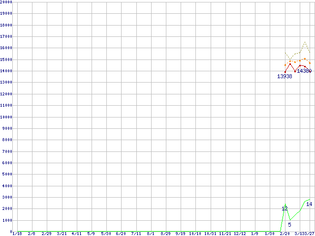 ※このグラフは過去のデータも税率5%相当に調整した税込み相当額のグラフです。 税率変更や、総額表示方式導入(2004年4月)の影響は除いています。 | | | ●凡例 | 最安値 (点線部は販売店未確認 または未調査) | 平均値 | 最高値 | ショップ数 |