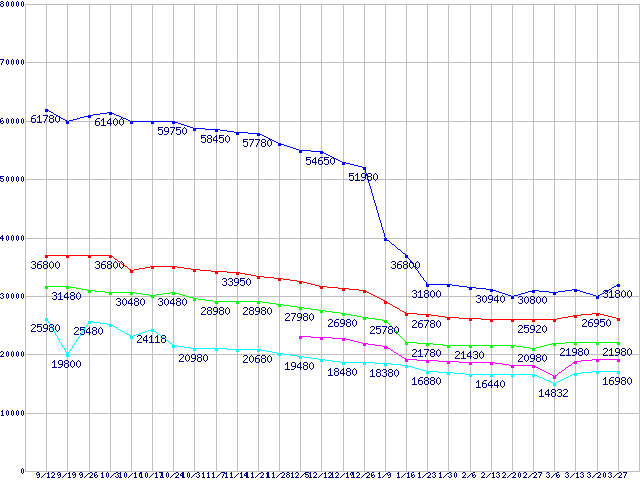 LGA1366 (QPI 4.8GT/s,L3キャッシュ8MB,Quad Core,Hyper-Threading)の最安値推移