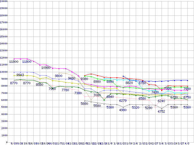 | CPU主要製品(最安値1万円未満)の最安値推移 | | | (2008年9月19日~2009年4月3日) |