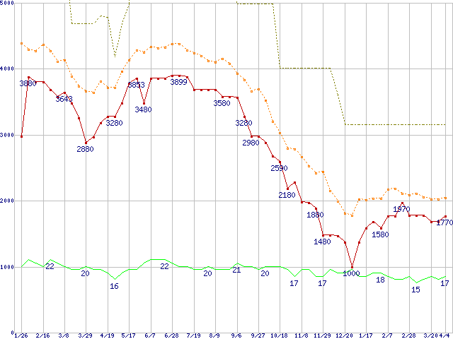 PC2-6400(DDR2-800) DDR2 SDRAM DIMMの最安値推移