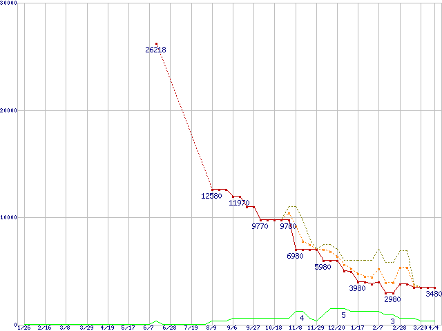 ※このグラフは過去のデータも税率5%相当に調整した税込み相当額のグラフです。 税率変更や、総額表示方式導入(2004年4月)の影響は除いています。 | | | ●凡例 | 最安値 (点線部は販売店未確認 または未調査) | 平均値 | 最高値 | ショップ数 |