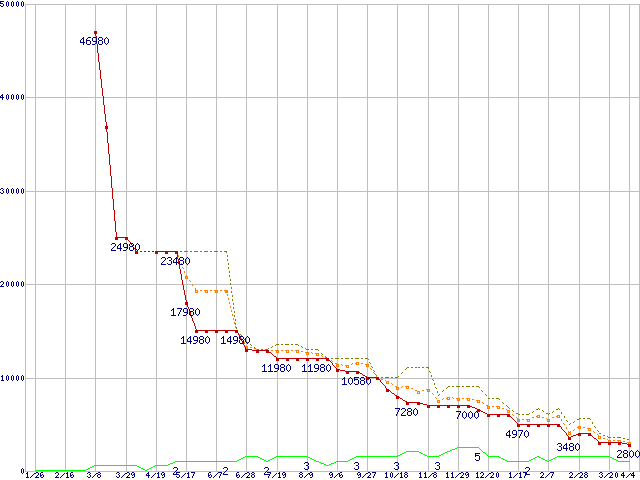 メモリ主要製品(最安値5千円未満)の最安値推移