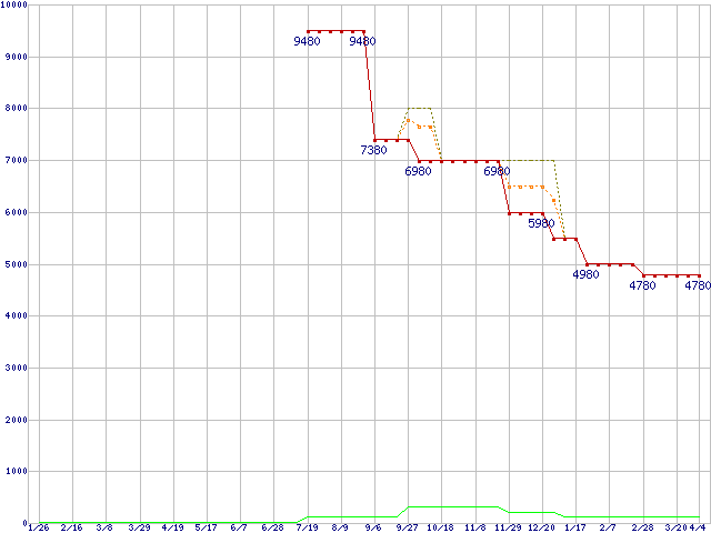 ※このグラフは過去のデータも税率5%相当に調整した税込み相当額のグラフです。 税率変更や、総額表示方式導入(2004年4月)の影響は除いています。 | | | ●凡例 | 最安値 (点線部は販売店未確認 または未調査) | 平均値 | 最高値 | ショップ数 |