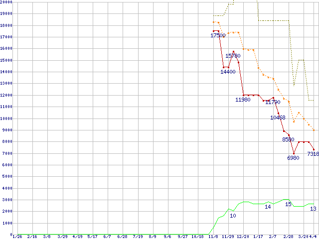 ※このグラフは過去のデータも税率5%相当に調整した税込み相当額のグラフです。 税率変更や、総額表示方式導入(2004年4月)の影響は除いています。 | | | ●凡例 | 最安値 (点線部は販売店未確認 または未調査) | 平均値 | 最高値 | ショップ数 |