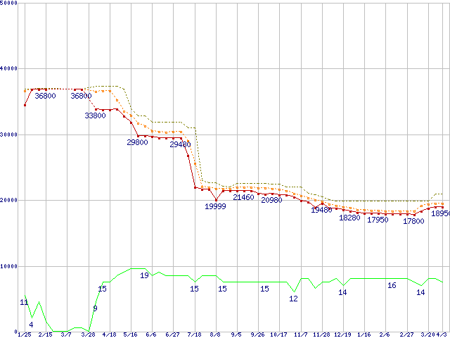 ※このグラフは過去のデータも税率5%相当に調整した税込み相当額のグラフです。 税率変更や、総額表示方式導入(2004年4月)の影響は除いています。 | | | ●凡例 | 最安値 (点線部は販売店未確認 または未調査) | 平均値 | 最高値 | ショップ数 |