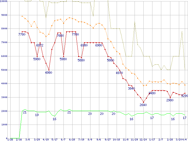 PC2-6400(DDR2-800) DDR2 SDRAM DIMMの最安値推移