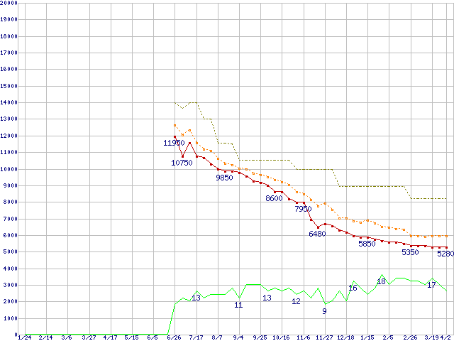 ※このグラフは過去のデータも税率5%相当に調整した税込み相当額のグラフです。 税率変更や、総額表示方式導入(2004年4月)の影響は除いています。 | | | ●凡例 | 最安値 (点線部は販売店未確認 または未調査) | 平均値 | 最高値 | ショップ数 |