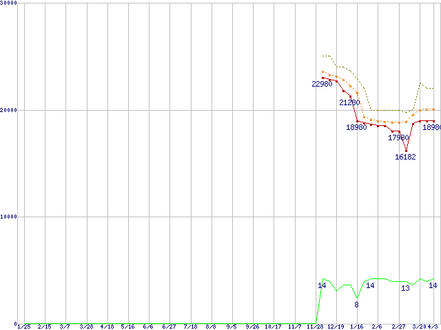 ※このグラフは過去のデータも税率5%相当に調整した税込み相当額のグラフです。 税率変更や、総額表示方式導入(2004年4月)の影響は除いています。 | | | ●凡例 | 最安値 (点線部は販売店未確認 または未調査) | 平均値 | 最高値 | ショップ数 |