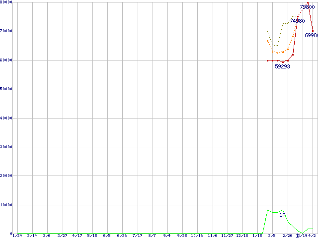 ※このグラフは過去のデータも税率5%相当に調整した税込み相当額のグラフです。 税率変更や、総額表示方式導入(2004年4月)の影響は除いています。 | | | ●凡例 | 最安値 (点線部は販売店未確認 または未調査) | 平均値 | 最高値 | ショップ数 |