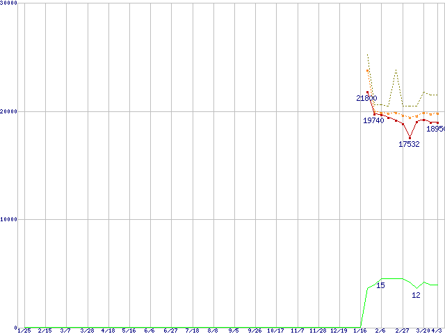 ※このグラフは過去のデータも税率5%相当に調整した税込み相当額のグラフです。 税率変更や、総額表示方式導入(2004年4月)の影響は除いています。 | | | ●凡例 | 最安値 (点線部は販売店未確認 または未調査) | 平均値 | 最高値 | ショップ数 |