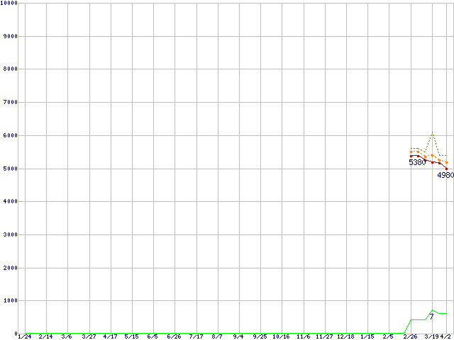 ※このグラフは過去のデータも税率5%相当に調整した税込み相当額のグラフです。 税率変更や、総額表示方式導入(2004年4月)の影響は除いています。 | | | ●凡例 | 最安値 (点線部は販売店未確認 または未調査) | 平均値 | 最高値 | ショップ数 |