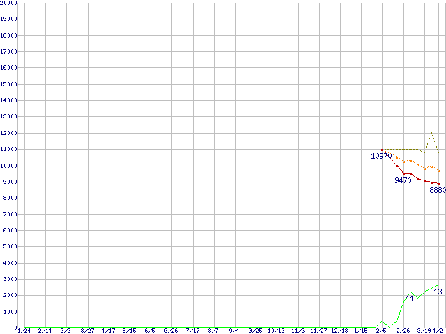※このグラフは過去のデータも税率5%相当に調整した税込み相当額のグラフです。 税率変更や、総額表示方式導入(2004年4月)の影響は除いています。 | | | ●凡例 | 最安値 (点線部は販売店未確認 または未調査) | 平均値 | 最高値 | ショップ数 |